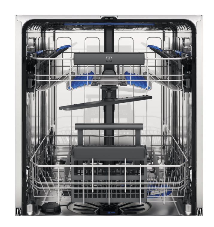 • Vlastnosti horního koše: šetrné úchyty na 12 sklenic na víno, 2 skládací držáky, 2 skládací drátěné držáky pro skleničky, 4 měkké špičky, skládací poličky na šálky, Stainless steel handle Electrolux
