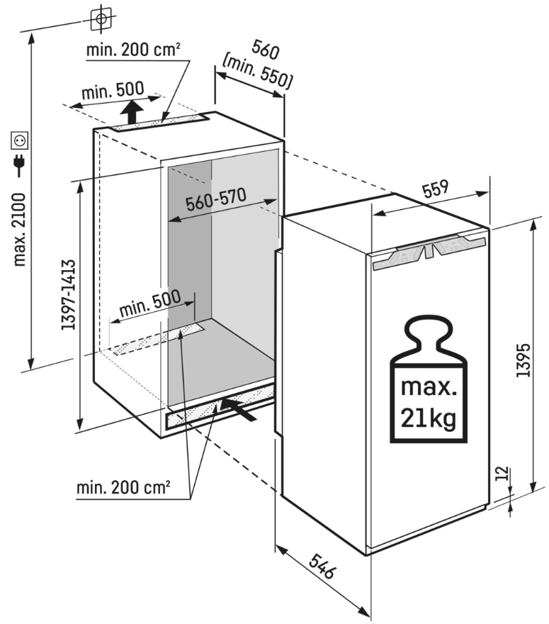 - Max. hmotnost dveří kuchyňské linky: 21kg
