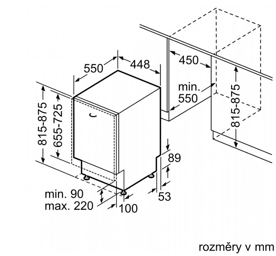 • Hloubka s otevřenými dvířky 90 stupňů 1 150 mm
