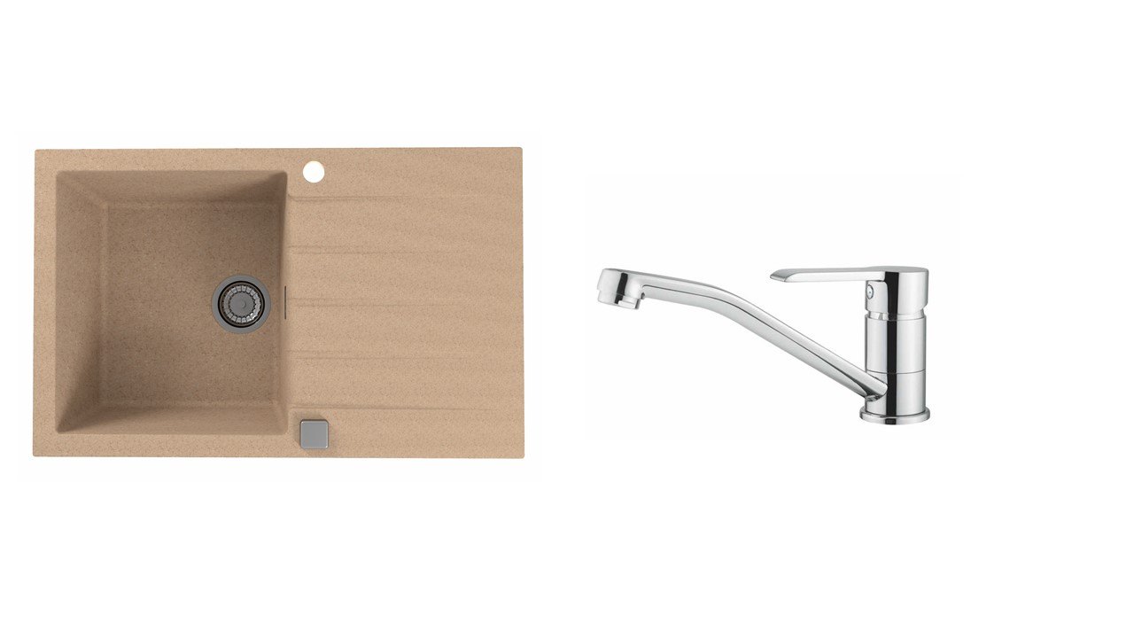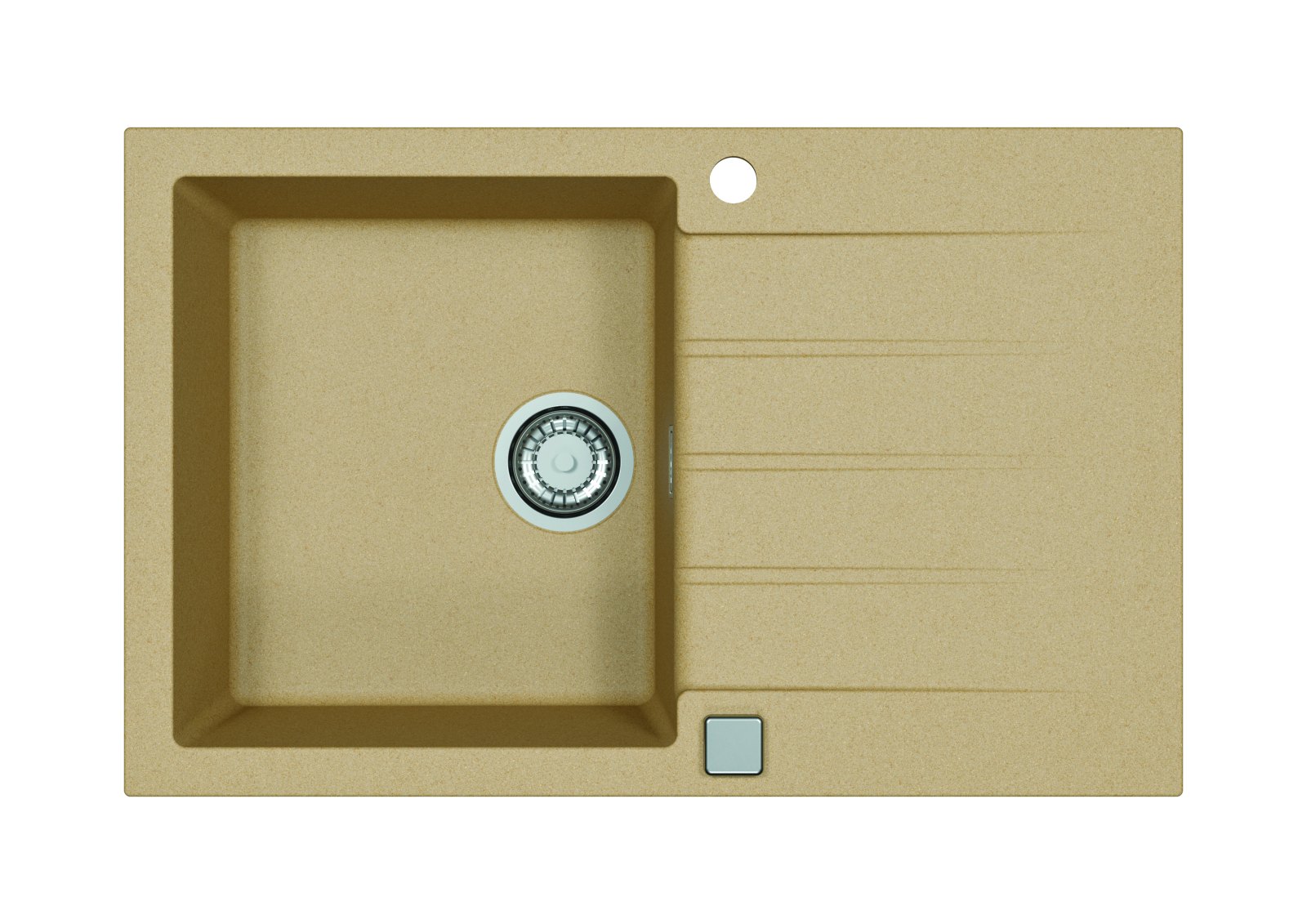 Vestavěný dřez, univerzál. Provedení : granitový dřez s odkapem Vnější rozměr: 790 x 500 mm Rozměr vaničky: 375 x 425 x 200 mm Excentrický sítkový ventil 3 1/2 s přepadem, sifon pro úsporu místa s odbočkou na myčku Úchyty a těsnění pro upevnění dřezu v balení S otvorem pro baterii