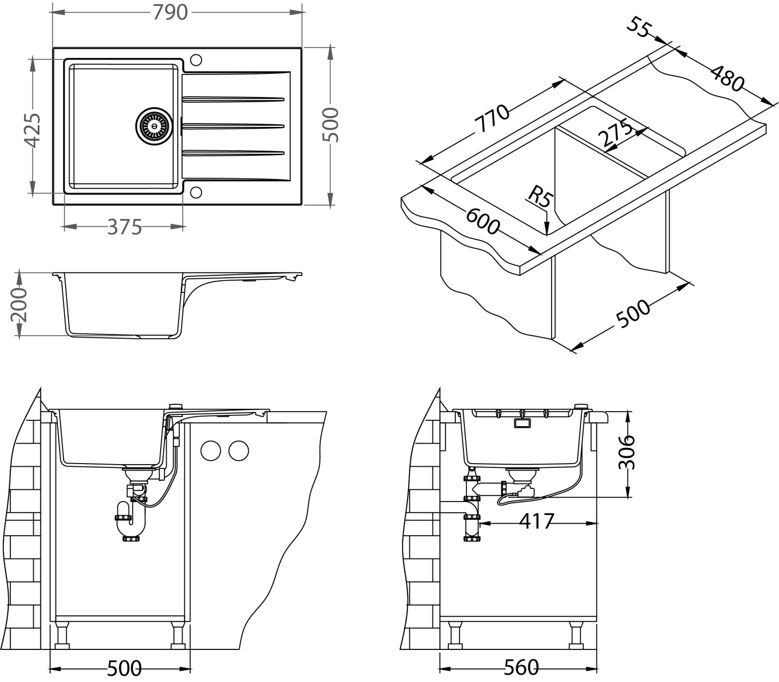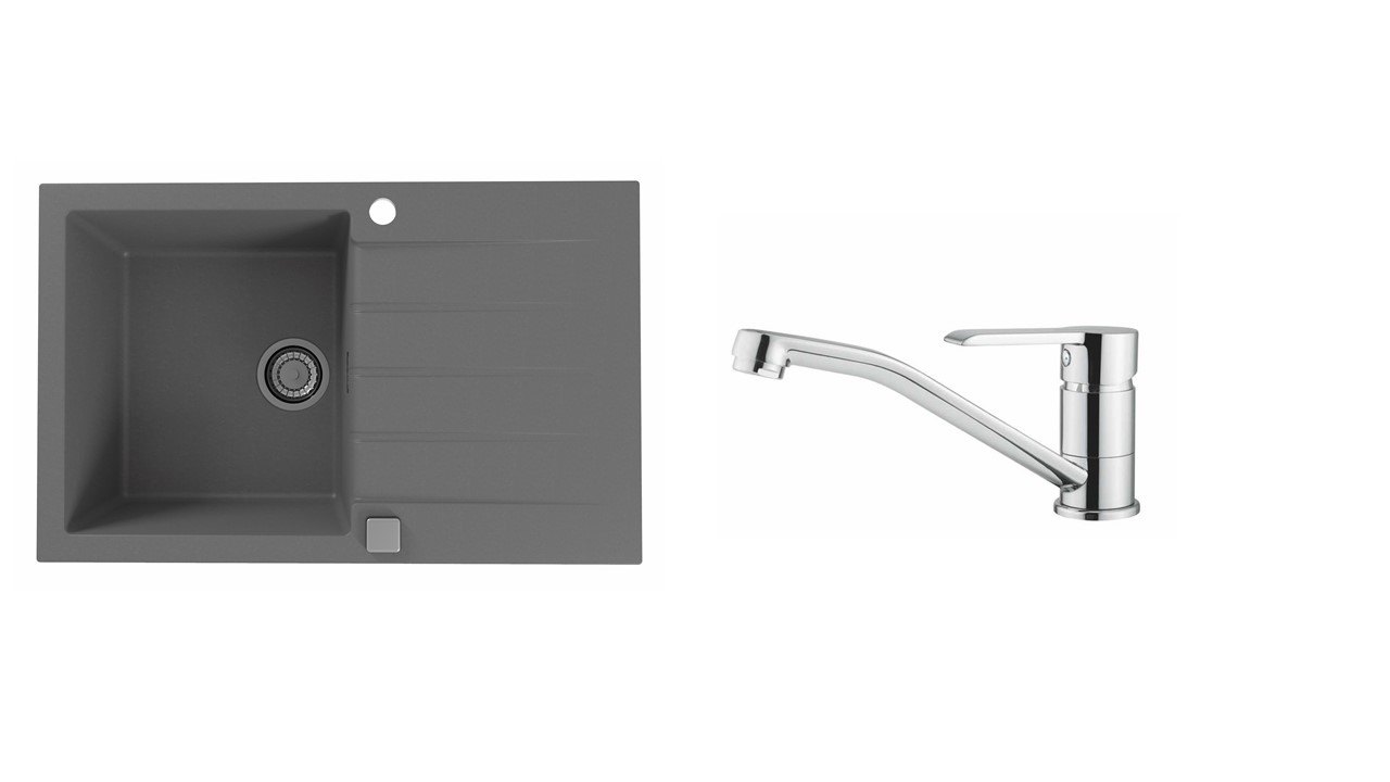 Vestavěný dřez, univerzál. Provedení : granitový dřez s odkapem Vnější rozměr: 790 x 500 mm Rozměr vaničky: 375 x 425 x 200 mm Excentrický sítkový ventil 3 1/2 s přepadem, sifon pro úsporu místa s odbočkou na myčku Úchyty a těsnění pro upevnění dřezu v balení S otvorem pro baterii