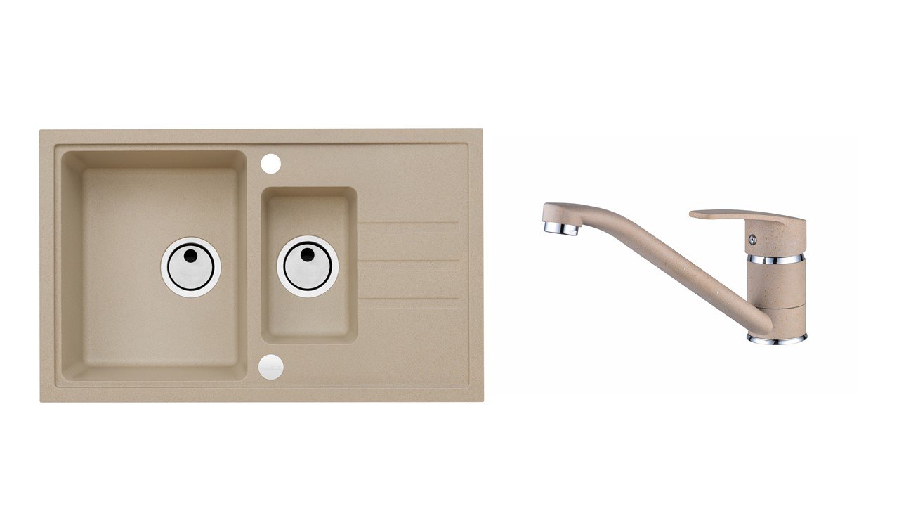Vestavěný dřez, univerzální Provedení : granitový dřez Vnější rozměr: 780x480 mm Rozměr vaničky: 330x405x200 mm Rozměr vaničky: 170x275x130 mm Manuální sifon 3 1/2 s přepadem, sifon pro úsporu místa s odbočkou na myčku. Úchyty a těsnění pro upevnění dřezu v balení S otvorem pro baterii