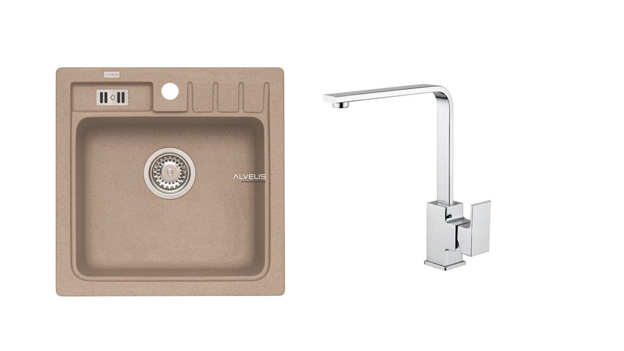 Vestavěný dřez, univerzál. Provedení : granitový dřez Vnější rozměr: 465 x 465 mm Rozměr vaničky: 380x320x180 mm sítkový ventil 3 1/2 s přepadem, sifon pro úsporu místa s odbočkou na myčku Úchyty a těsnění pro upevnění dřezu v balení S otvorem pro baterii