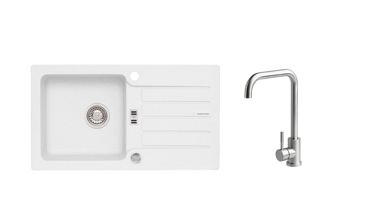 Vestavěný dřez, univerzál. Provedení : granitový dřez s odkapem Vnější rozměr: 775 x 430 mm Rozměr vaničky: 350x350x160 mm Exentický sítkový ventil 3 1/2 s přepadem, sifon pro úsporu místa s odbočkou na myčku Úchyty a těsnění pro upevnění dřezu v balení S otvorem pro baterii