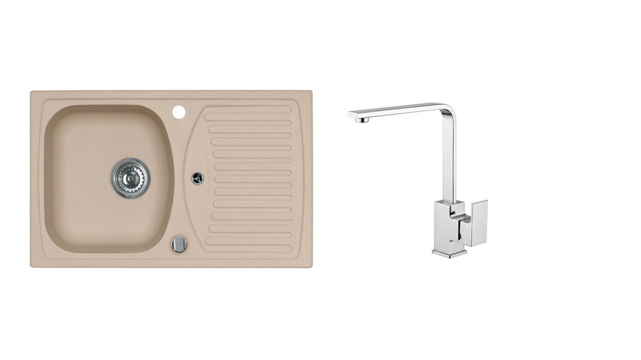 Vestavěný dřez, univerzál. Provedení : granitový dřez s odkapem Vnější rozměr: 780 x 480 mm Rozměr vaničky: 359 x 399 x 160 mm Exentrický sítkový ventil 3 1/2 s přepadem, sifon pro úsporu místa s odbočkou na myčku Úchyty a těsnění pro upevnění dřezu v balení S otvorem pro baterii