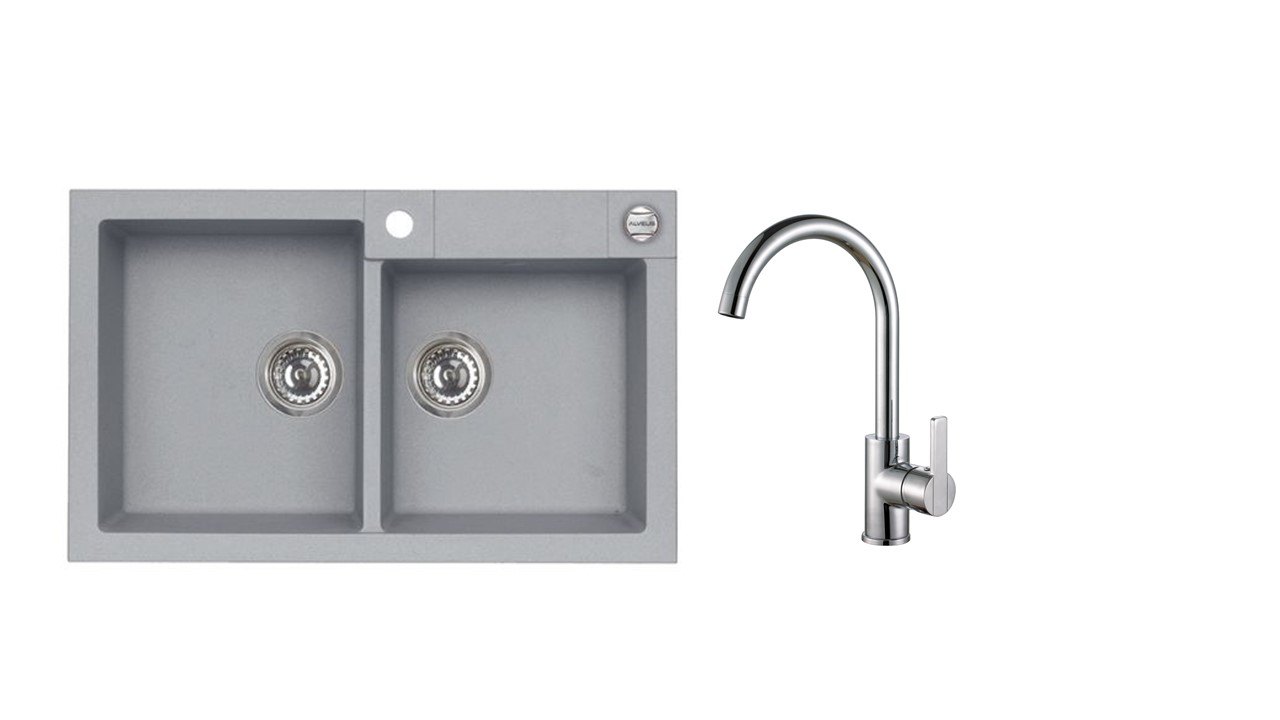Vestavěný dřez, univerzál. Provedení : granitový dřez Vnější rozměr: 780 x 480 mm Rozměr vaničky: 340 x 400 x 180 mm 340 x 350 x 180 mm Exentrický sítkový ventil 3 1/2 s přepadem, sifon pro úsporu místa s odbočkou na myčku Úchyty a těsnění pro upevnění dřezu v balení S otvorem pro baterii