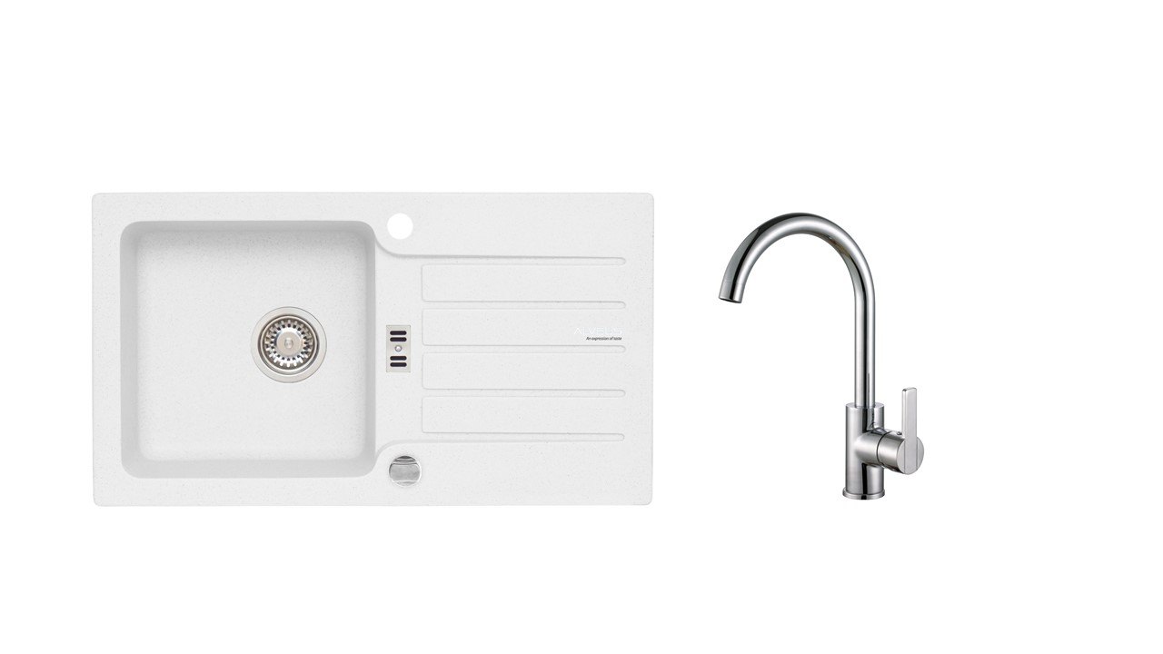 Vestavěný dřez, univerzál. Provedení : granitový dřez s odkapem Vnější rozměr: 775 x 430 mm Rozměr vaničky: 350x350x160 mm Exentický sítkový ventil 3 1/2 s přepadem, sifon pro úsporu místa s odbočkou na myčku Úchyty a těsnění pro upevnění dřezu v balení S otvorem pro baterii