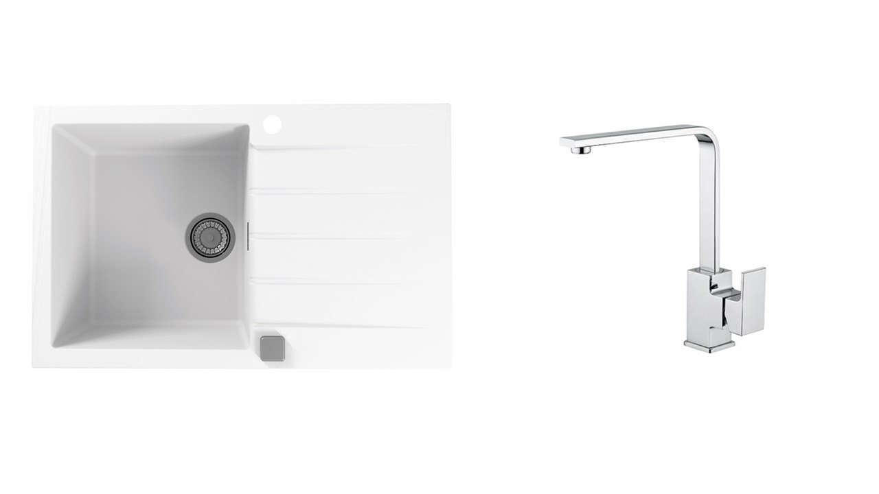 Vestavěný dřez, univerzál. Provedení : granitový dřez s odkapem Vnější rozměr: 790 x 500 mm Rozměr vaničky: 375 x 425 x 200 mm Excentrický sítkový ventil 3 1/2 s přepadem, sifon pro úsporu místa s odbočkou na myčku Úchyty a těsnění pro upevnění dřezu v balení S otvorem pro baterii