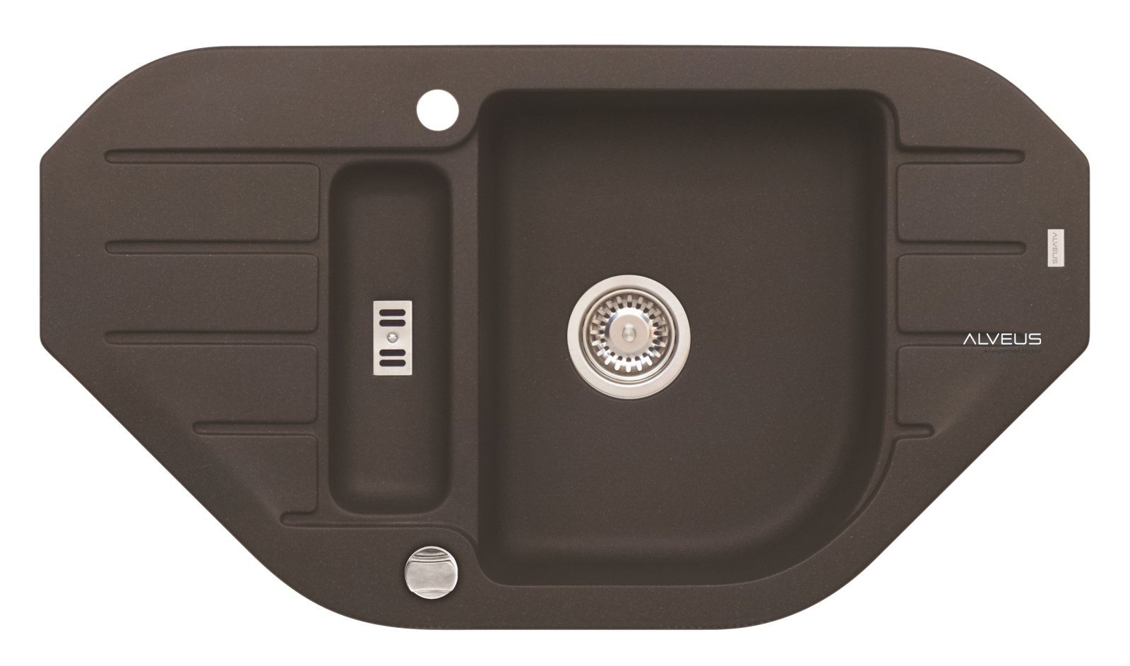 Vestavěný dřez, univerzál. Provedení : granitový dřez s odkapem Vnější rozměr: 900 x 500 mm Rozměr vaničky: 344x430x160 mm 100x295x70 mm Exentický sítkový ventil 3 1/2 s přepadem, sifon pro úsporu místa s odbočkou na myčku Úchyty a těsnění pro upevnění dřezu v balení S otvorem pro baterii