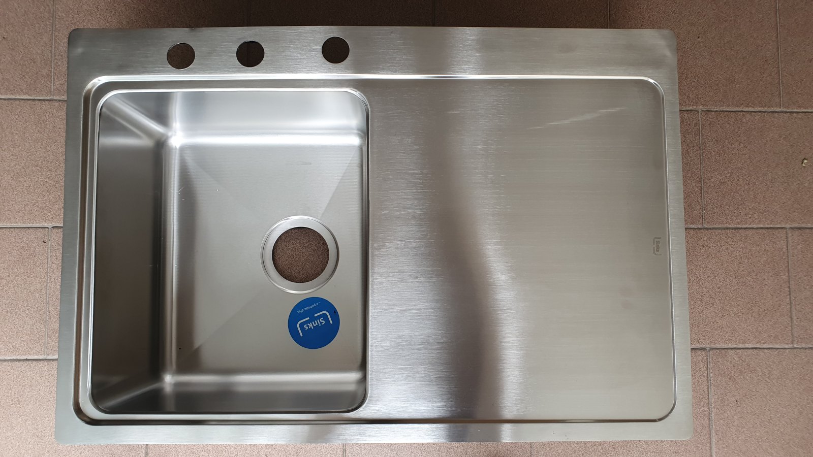 Mírné prohnutí na horní liště dřezu. 3 předvrtané otvory: baterie, dávkovač, excentr. Dřez byl vystaven. Sítkový ventil, sifon a montážní kování nejsou součástí balení.