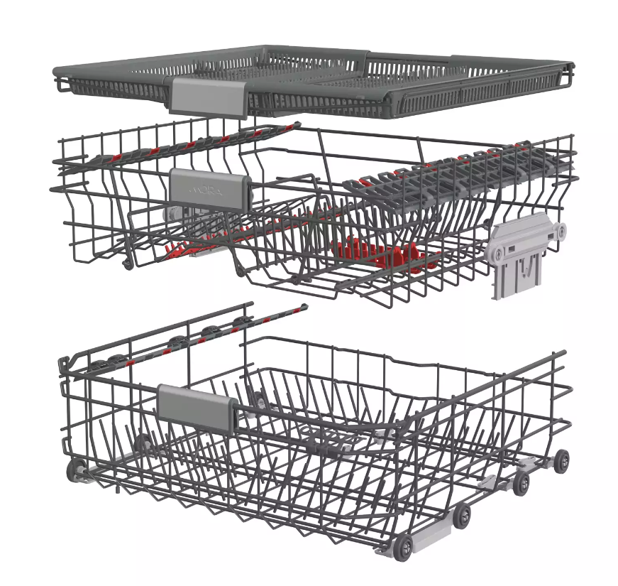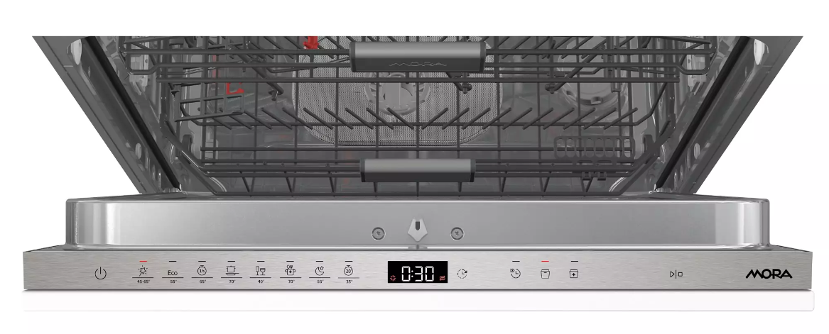Vestavná plně integrovaná myčka MORA IM 647C5 v úsporné energetické třídě C si při standardní šířce 60 cm poradí s neuvěřitelnými 16 sadami nádobí. Nádobí dokonale umyje díky třem ostřikovacím ramenům a pěti výškovým úrovním proudu vody, takže bude bezvadně čisté, i když bude myčka opravdu plná a nádobí bude hustě naskládané. Je vybavená třemi koši s pohyblivými prvky a přizpůsobitelným nastavením. Vodící lišty v horním koši jsou navíc opatřeny kuličkovými ložisky. Horní koš slouží pro pečlivé a šetrné mytí příborů a kuchyňského náčiní, levý a pravý panel můžete posouvat podle toho, jak velký prostor v horním koši potřebujete. V horním a spodním koši najdete prostor i pro vyšší skleničky na víno. Speciální pryžový materiál je udrží v pevné poloze. Tyto držáky jsou flexibilní a dělitelné, s vyhrazeným prostorem pro různý počet sklenic, aby vyhovovaly vašim potřebám. Skrytý ovládací panel je opatřen dotykovým ovládáním s displejem a mnoha praktickými funkcemi, jako je například RychléMytí, které umožňuje zkrátit délku vybraných programů. Zvolíte-li funkci SušeníPlus, po ukončení programu se automaticky pootevřou dvířka, aby tak unikla pára a následný sušicí cyklus byl efektivnější a energeticky úsporný. Energii pomáhá šetřit i možnost připojení přímo na teplou vodu pomocí speciální hadice, odolávající vysokým teplotám. Samozřejmostí je úsporný ECO Program nebo AUTO Program, který sám zvolí optimální parametry mytí. Vhod přijde i odložený start až o 24 hodin. Myčka má navíc praktický samočisticí filtr, a tak automaticky odstraní zbytky mastnoty a jídla ve filtru a zamezí nesprávnému chodu spotřebiče. Se systémem AquaStop se nemusíte obávat nemilého překvapení v podobě vytopení. Myčka je osazená novým výkonným invertorovým motorem a dokonce se i sama vyčistí – stačí jednou za měsíc pustit automatický program čiťtění, který vyčistí vanu, ostřikovací ramena i trysky.