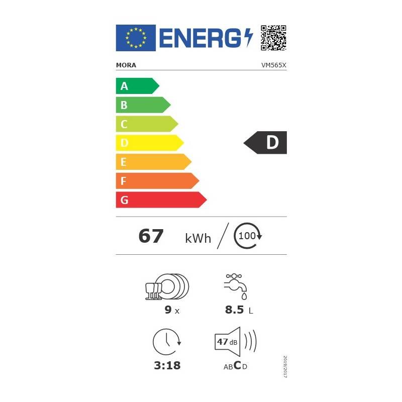 Vestavná myčka Mora VM 565 X v šíře 45 cm je výjimečná pro svou nízkou spotřebu energie, díky které je řazená do energeticky velmi úsporné třídy D. Se 2 zásuvkami je vhodná i do menších rodin nebo kde není dostatek prostoru v kuchyni a je do ní možné umístit 9 jídelních sad najednou. Předení ovládací panel se ovládá tlačítky. Díky funkci SušeníPlus se dvířka po ukončení mycího cyklu automaticky pootevřou, aby tak unikla pára a následní sušící cyklus byl efektivnější a energeticky úsporný. Se systémem AquaStop se nemusíte obávat nemilého překvapení v podobě vytopení. Přívodní hadice se totiž skládá ze dvou odolných vrstev a hned u vodovodního kohoutku je bezpečnostní ventil, který vám zaručí maximální ochranu vašeho domova před poničením vodou.