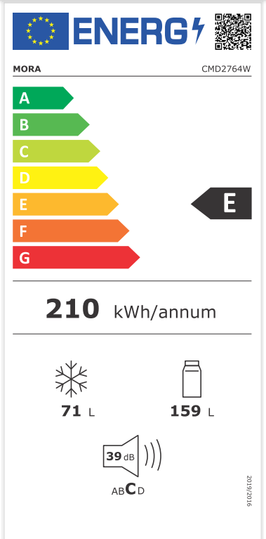 Kombinovaná chladnička MORA CMD 2764 W má praktické volně stojící provedení s hloubkou až 56 cm, takže ji můžete zarovnat s kuchyňskou linkou. Užitný objem 230 litrů je rozdělen na chladicí část o objemu 159 litrů a mrazicí část o objemu 71 litrů. Chladnička je ideální pro větší domácnosti se třemi nebo čtyřmi členy a spadá do energetické třídy E s roční spotřebou energie 210 kWh. Velmi praktická je funkce automatického odmrazování chladicího prostoru, která usnadňuje údržbu a šetří váš čas. Mrazicí část dokáže zmrazit 3,2 kg potravin za 24 hodin a v případě výpadku proudu udrží teplotu v mrazničce až 11,5 hodiny. Třída mrazení je označena čtyřmi hvězdičkami. Tichý provoz s hlučností 39 dB je vynikající.