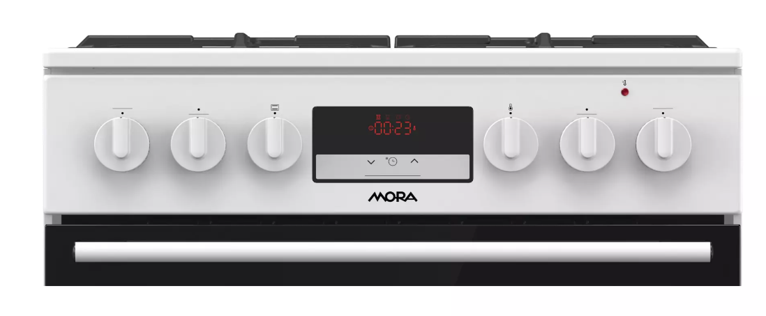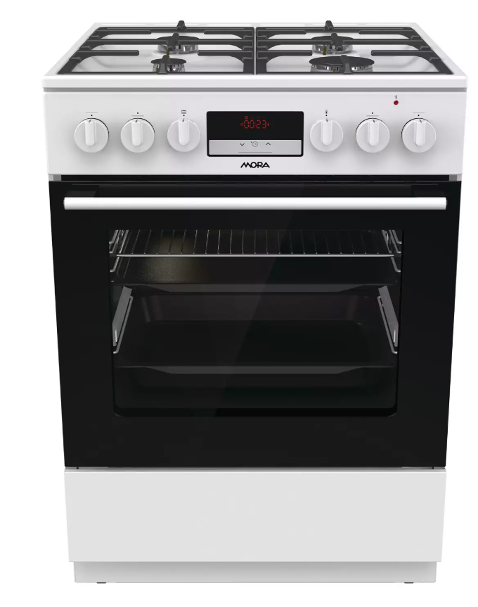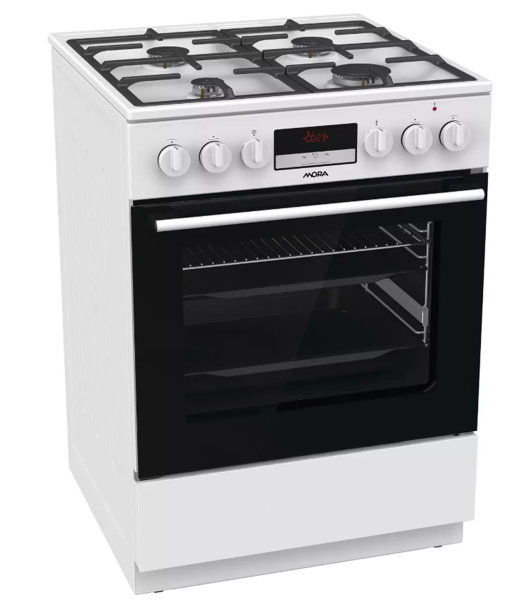 Kombinovaný sporák Mora K 8668 B1W6, v šířce 60 cm, v bílém provedení s multifunkční troubou v objemu 71 l Vás překvapí energeticky úspornou třídou A. Plynové hořáky s pojistkami STOP GAS a integrovaným zapalováním jsou kryté dvoudílnou mřížkou STABIL PLUS, která zajišťuje bezpečný posun nádobí ve všech směrech. Díky digitálnímu časovému spínači s hodinami se Vám již nikdy nespálí oběd, tato praktická funkce Vám přinese mnoho užitku. Lze nastavit odložený start a ukončení pečení, pouze ukončení pečení a minutka, samozřejmostí je nastavený aktuální čas. Disponuje funkcí páry, kterou ocení především příznivci zdravé výživy. Připravíte s ní jídla rychle a šetrně, takže si zachovají maximum vitamínů a stopových prvků. Dále je trouba vybavená 11 pečicími programy, které jsou navržené přesně podle potřeb konkrétních jídel. Vykouzlíte například výbornou pizzu jako z italské restaurace (program Pizza), pomalu upečete pečínku a efektivně rozmrazíte hotové porce jídla. Pokud si rádi pochutnáváte na hranolkách nebo kuřecích nugetách, ale nedopřáváte si je tak často kvůli vysoké kalorické hodnotě, můžete také zkusit program pro horkovzdušné fritování bez tuku. Hotovky většinou volíme tehdy, když nás tlačí čas. Zvykli jste si, že předehřátí trouby trvá celou věčnost? Na to teď zapomeňte. Tato trouba se předehřeje na 200 ˚C do 5 minut, což je mnohem rychleji, než bývá zvykem. Nové bezpečné závěsy dvířek zaručují bez Vaší asistence velmi tiché a šetrné zavírání dvířek trouby. Pro zvýšení komfortu obsluhy je trouba vybavená teleskopickým výsuvem, které umožní bezpečnou manipulaci s připravovaným jídlem, aniž byste ho museli z trouby vytáhnout. Ve spodní části sporáku je praktický úložný prostor, do kterého snadno uložíte příslušenství v podobě roštu, mělkého plechu a MAXI pekáče XXL o objemu až 8 l. Perfektní vyčištění vnitřního prostoru po každém pečení zajistí funkce ECO CLEAN, díky které odstraníte i větší nečistoty bez nutnosti použít čisticí prostředek.