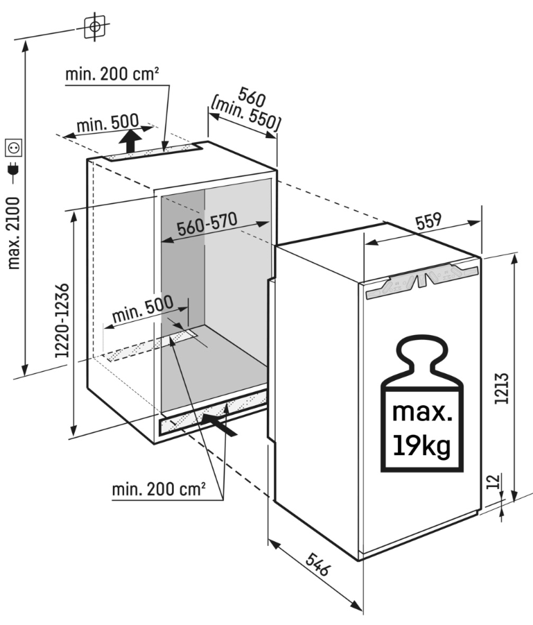 - Max. hmotnost dveří kuchyňské linky: 19kg