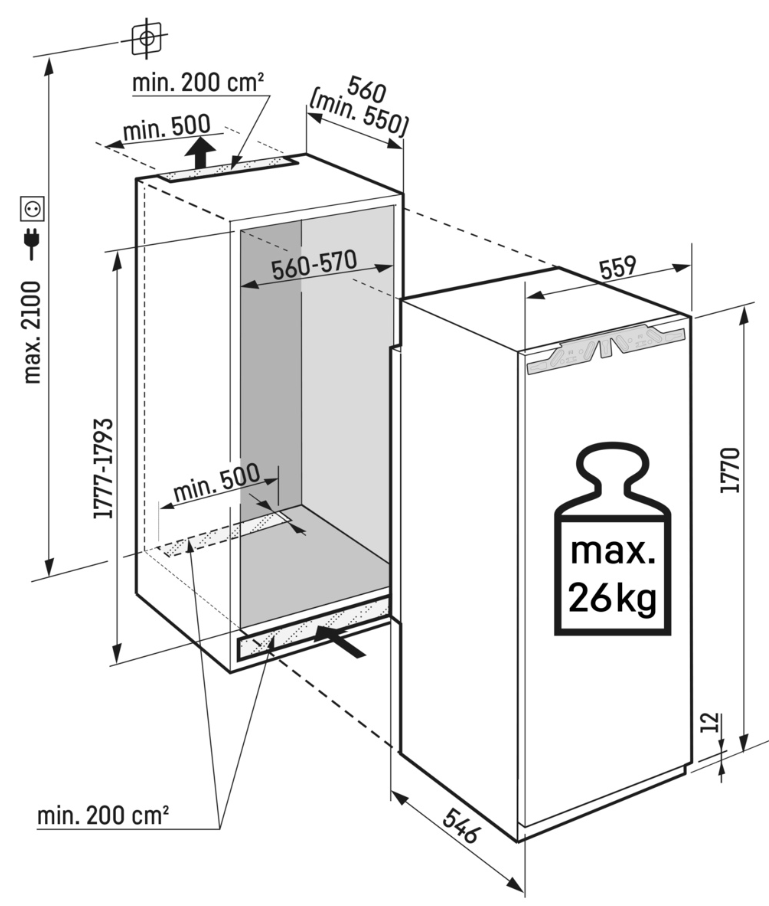 - Max. hmotnost dveří kuchyňské linky: 26
