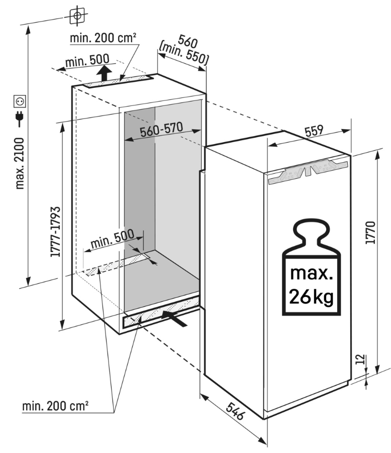 - Max. hmotnost dveří kuchyňské linky: 26