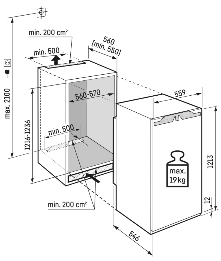 - Max. hmotnost dveří kuchyňské linky: 19kg