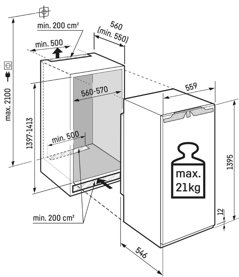 - Max. hmotnost dveří kuchyňské linky: 21kg