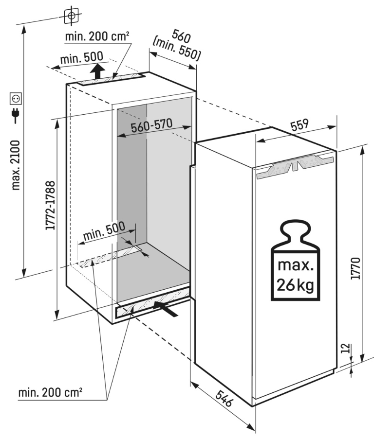 - Max. hmotnost dveří kuchyňské linky: 26