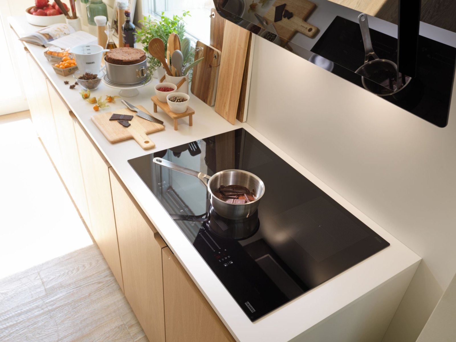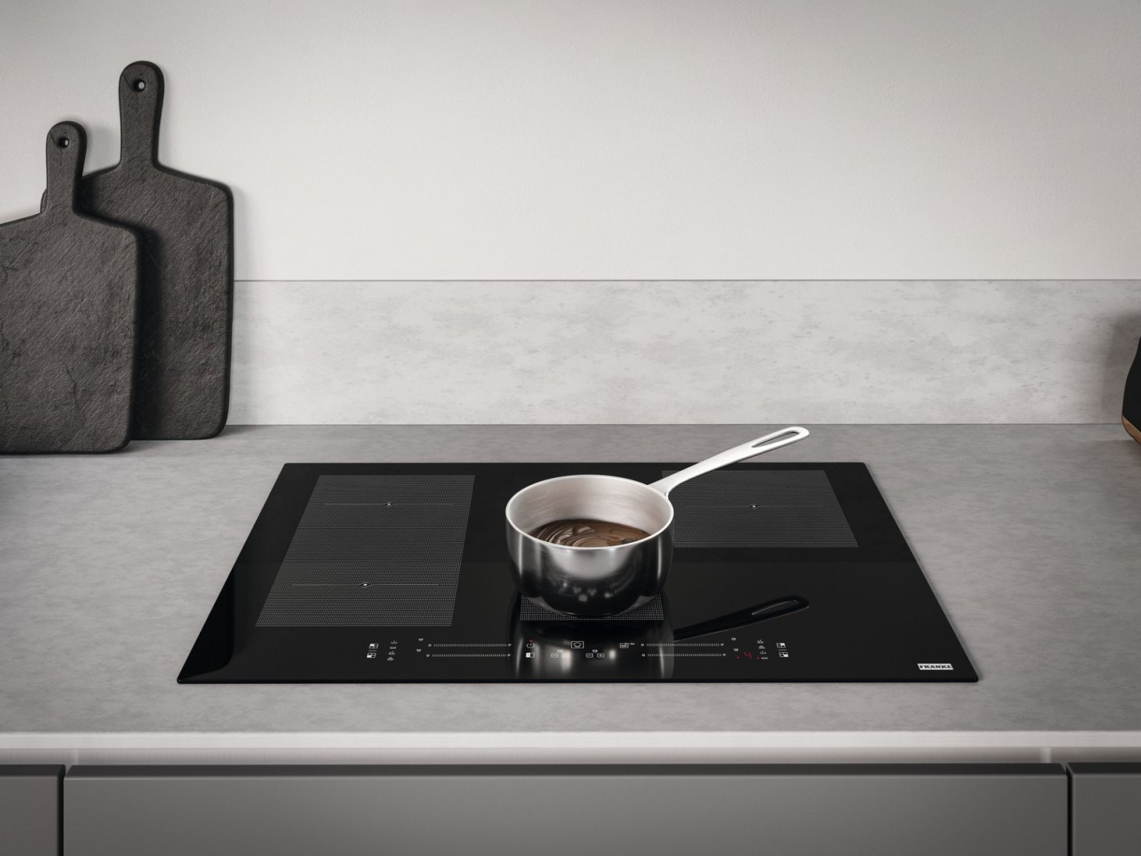 Indukční varná deska z řady Maris. Provedení černé sklo s bílou grafikou. 4 Varné zóny. 1× Flexi zóna. Červený integrovaný dotykový ovládací panel + Dotykový ovladač typu Slide. 18 Úrovní ohřevu. Funkce Cook Assist. Flexi zóna. Booster. Dětský zámek. Časovač 4×.