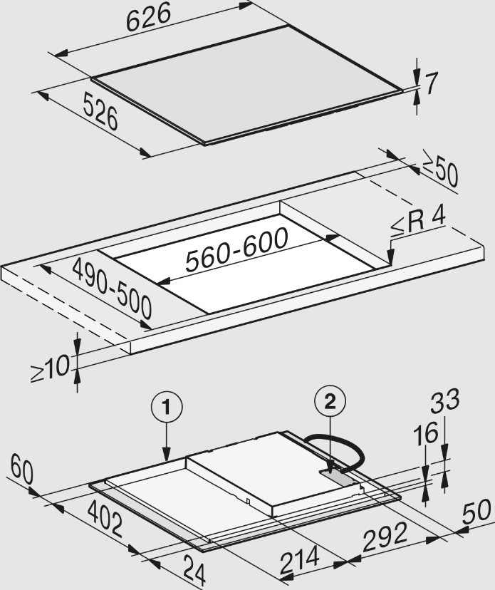 • Rozměry výřezu v mm (hloubka) při instalaci bez rámu na pracovní desku: 490