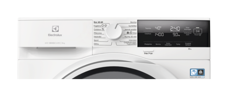 • Funkce: zap./vyp., TEMP SELECTION, výběr otáček, předpírka, STAIN, pouze máchání, tichý, snadné žehlení, DELAY, TIME MANAGER, start/pauza