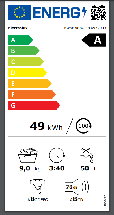 Náplň prádla max. : 9 kgEnergetická třída: AMax. otáčky / min: 1400